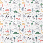 🦕 Dino Land – wesoła i wyrazista tkanina pełna motywów dinozaurów, natury i przygód. Dzięki delikatnej palecie kolorów pozostaje zabawna, ale nie przytłaczająca. Doskonały wybór do pokoju dziecięcego – zarówno dla chłopców, jak i dziewczynek.