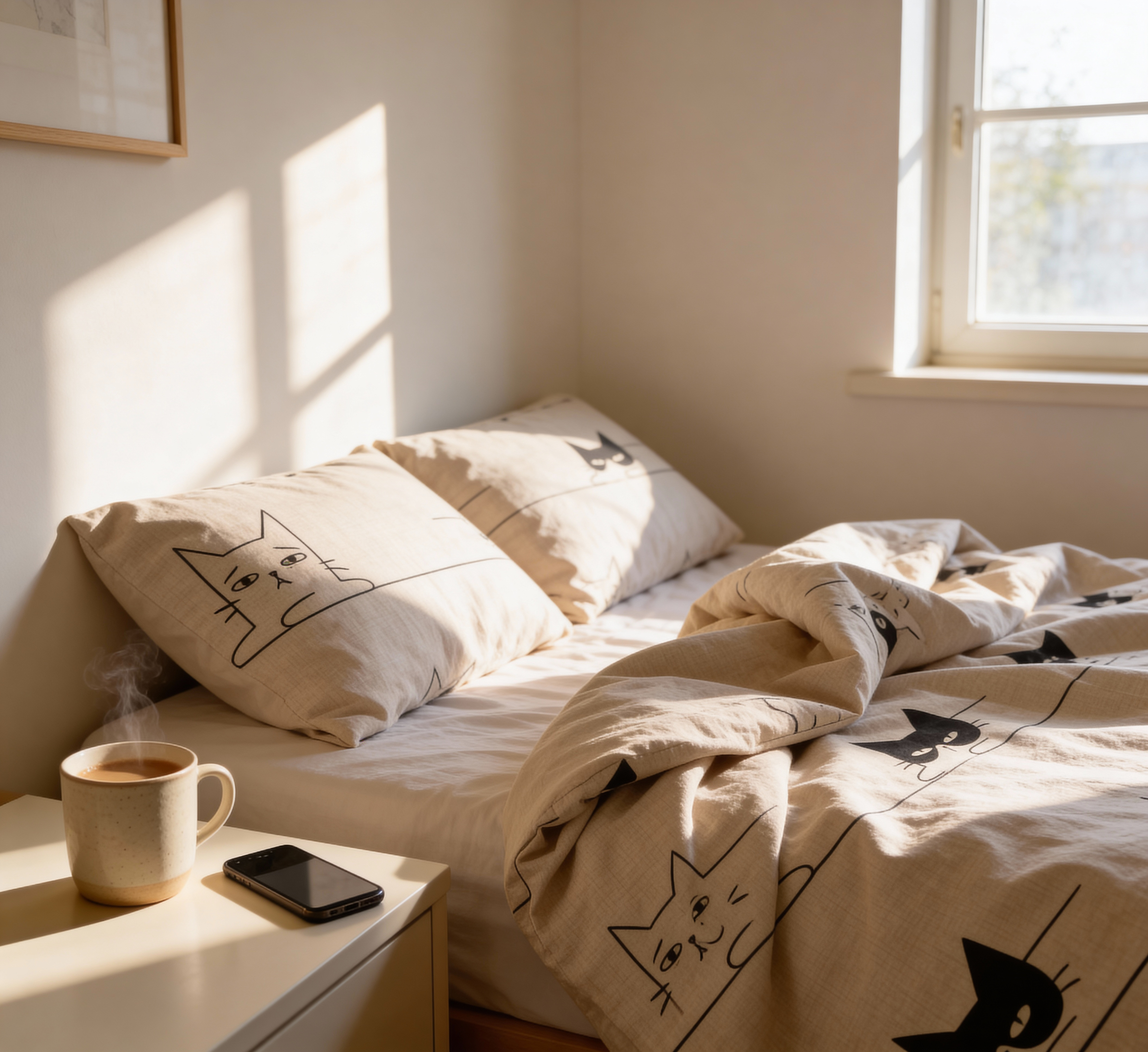 😺 Kitty – zabawny i figlarny design, w którym minimalistyczne rysunki kotów wprowadzają do wnętrza uśmiech i przytulność. Czarne kontury na piaskowym tle tworzą nowoczesne, ale lekkie wrażenie. Doskonały wybór dla tych, którzy cenią humor i oryginalność nawet w sypialni.