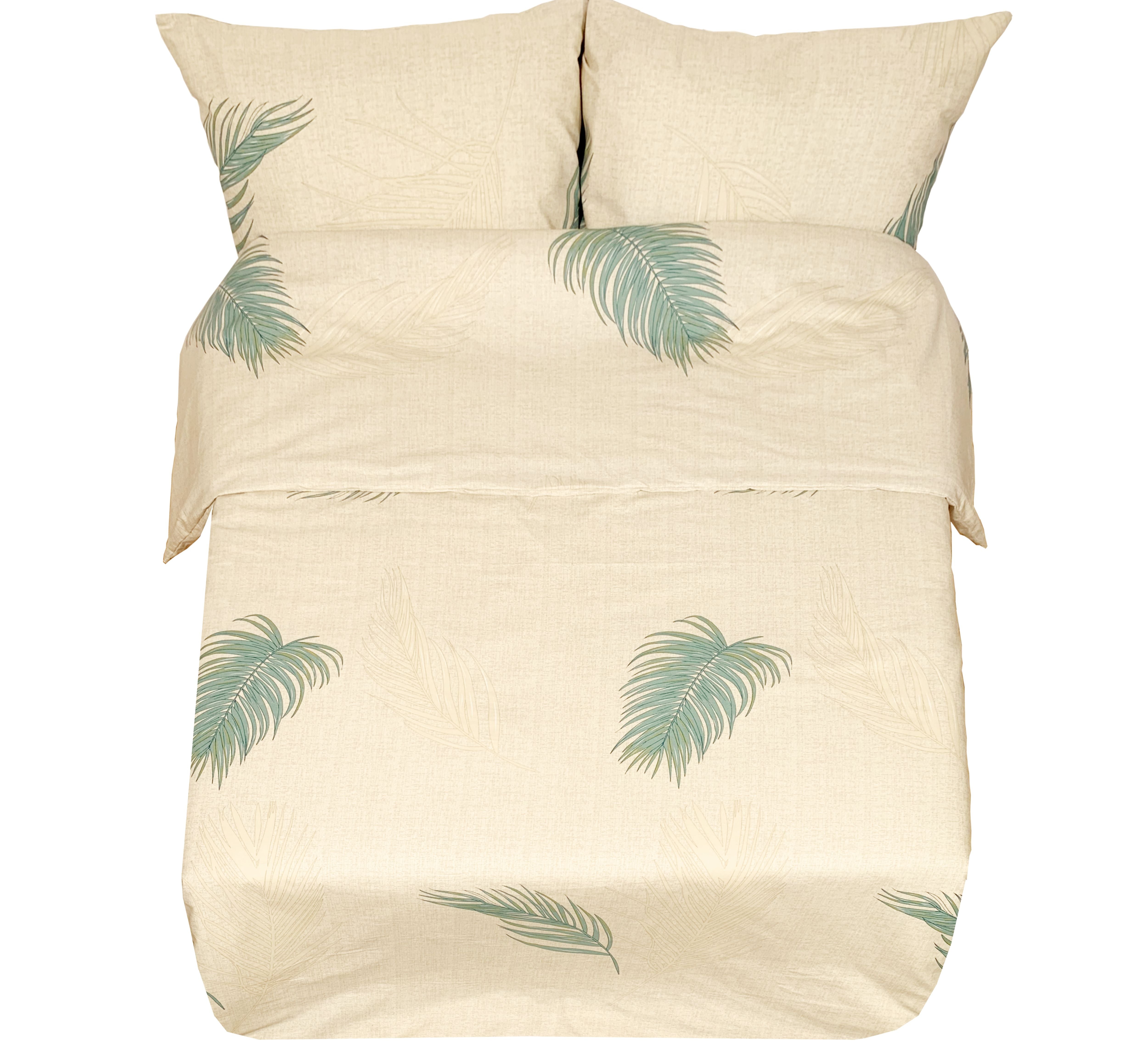 Tropica – świeży motyw tropikalnych liści na delikatnym piaskowym tle, tworzący atmosferę spokoju i relaksu. Naturalny i lekki design, idealny dla nowoczesnej lub boho poszwy na kołdrę.