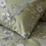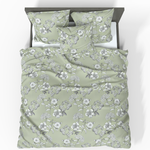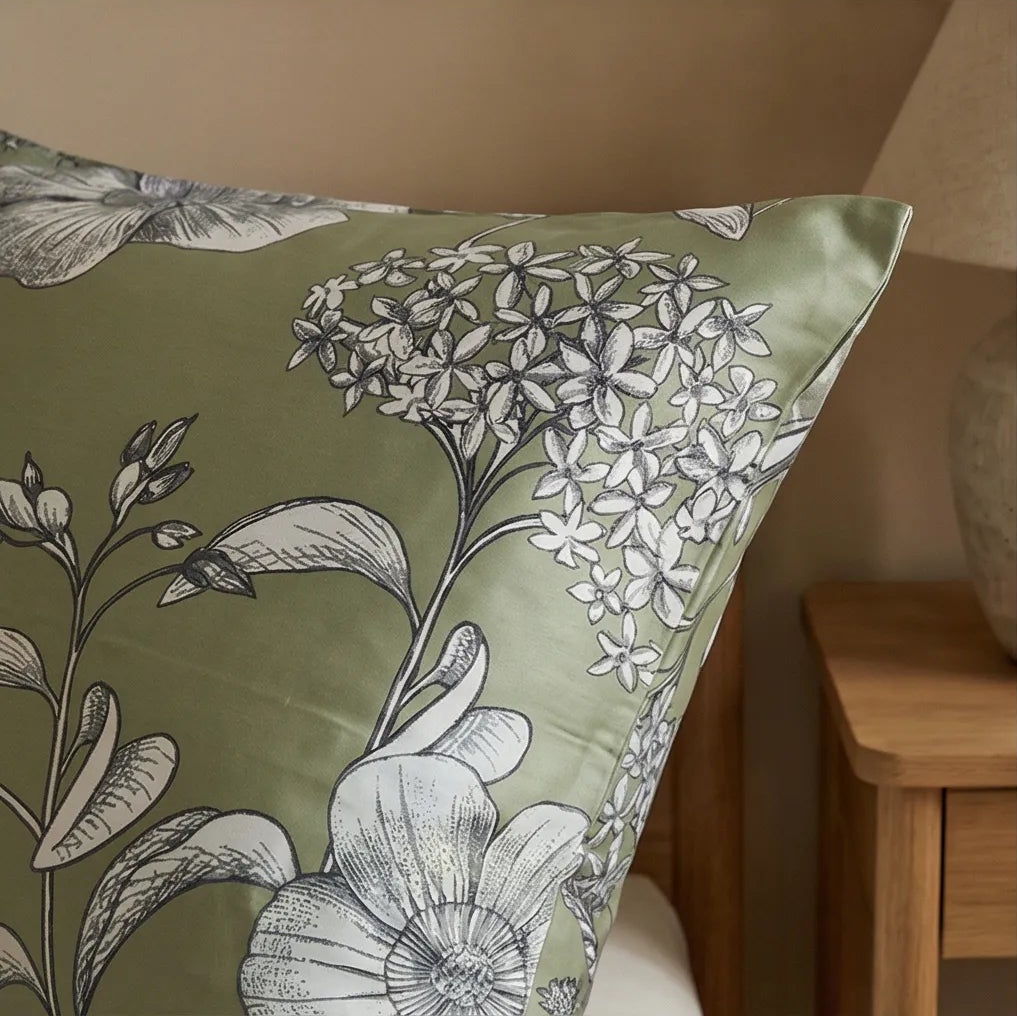 Ten komplet pościeli z satyny bawełnianej Deluxe, inspirowany brzegami jeziora Genewskiego oraz spokojem szwajcarskich ogrodów, wyróżnia się łąkowymi kwiatami, subtelnie zdobionymi na jasnym tle oliwkowej zieleni. To świeży, naturalny design, emanujący spokojem, czystością i delikatną kobiecością.
