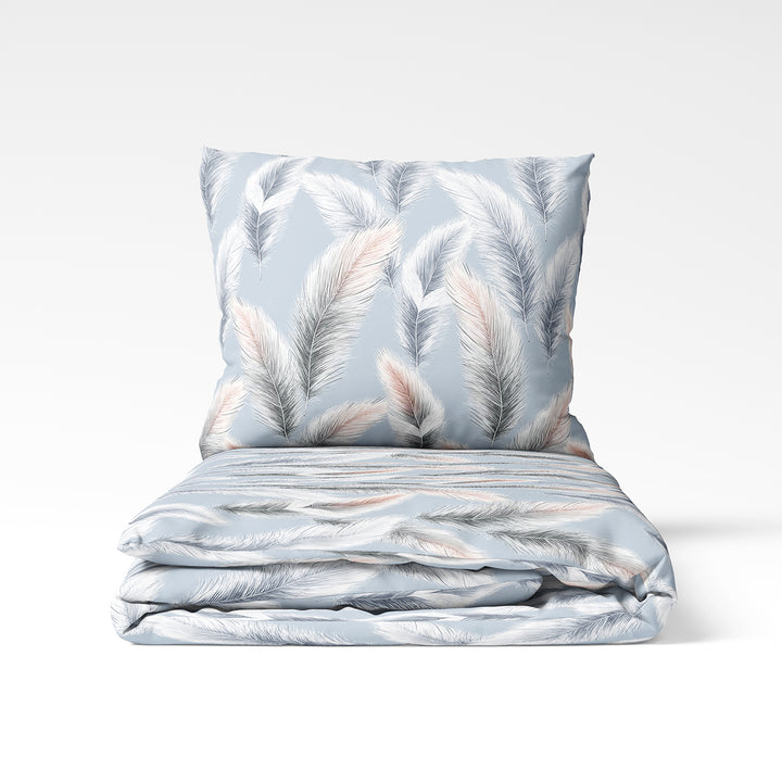 ☁️ Feather Sky – eleganter Baumwollstoff mit Feder-Motiv. Sein hellblauer Hintergrund und die dezenten Pastellfarben passen perfekt zu einem ruhigen Interieur und Textilkreationen, die Leichtigkeit und Frische ausstrahlen.